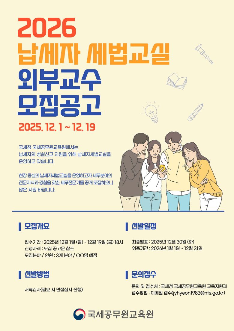 ±¹¼¼Ã» ±¹¼¼°ø¹«¿ø±³À°¿ø¿¡¼ ¡®±¹¼¼Ã» ±¹¼¼°ø¹«¿ø±³À°¿ø ³³¼¼ÀÚ¼¼¹ý±³½Ç ¿ÜºÎ±³¼ö °ø°³¸ðÁý¡¯°ú °ü·ÃÇÏ¿© ¿ì¸® ȸ¿¡ È«º¸ ¿äûÇÏ¿´±â¿¡ ¾Æ·¡¿Í °°ÀÌ ¾È³»ÇÕ´Ï´Ù. 1. Á¢¼ö±â°£: 2025.12.1.(¿ù)~2025.12.19.(±Ý) 18:00 2. ½ÅûÀÚ°Ý ¹× ¸ðÁýºÐ¾ß: ºÙÀÓ ÂüÁ¶ 3. ¼±¹ß¹æ¹ý: ¼·ù½É»ç(ÇÊ¿ä½Ã ¸éÁ¢½É»ç ÁøÇà) 4. ¼±¹ßÀÏÁ¤: 1) ÃÖÁ¾¹ßÇ¥: 2025.12.30.(È) 2) À§Ã˱Ⱓ: 2026.1.1.~2026.12.31. 5. Á¢¼ö¹æ¹ý: À̸ÞÀÏ Á¢¼ö(jyhyeon1983@nts.go.kr) 6. ¹®ÀÇ: ±¹¼¼Ã» ±¹¼¼°ø¹«¿ø±³À°¿ø ±³À°Áö¿ø°ú(¿¬¶ôó: 064-731-3215)