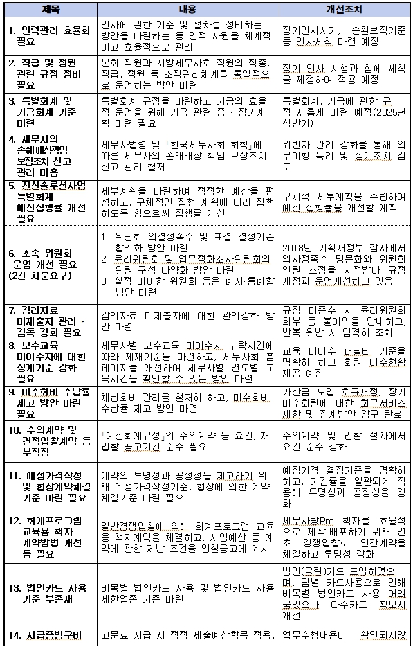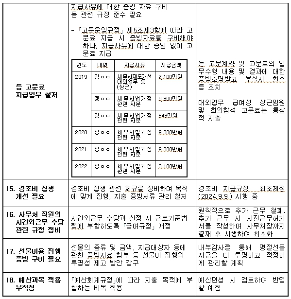 ½Ç·Ê·Î 2018³â °¡Àå ½É°¢ÇÑ ¹®Á¦·Î Áï°¢ ½ÃÁ¤¿ä±¸¸¦ ¿ä±¸¹ÞÀº »çÇ×ÀΡ®ÀÓ¿ø¼ö´ç ÁöÃâ³»¿ªÀ» Åõ¸íÇÏ°Ô °ü¸®¡¯¿¡ ´ëÇÏ¿© Áö³ 5³â°£ ÀÏü ½ÃÁ¤ÇÏÁö ¾Ê¾ÒÀ¸³ª Á¦33´ë Çѱ¹¼¼¹«»çȸ ±¸ÀçÀÌ È¸ÀåÀº ºÒ¿ëÀÌ ¹Ýº¹µÇ°Å³ª ÁöÃâ³»¿ëÀÌ ºÒÅõ¸íÇÏ¿© »çÀûÀÌÀÍÀÌ µÇ´Â °ÍÀ¸·Î ÀÇ½É ¹Þ¾Æ¿Â ¿¹»êÀÇ Ã¶Æó Áö½Ã¿¡ µû¶ó 2024. 2¿ù 2024ȸ°è¿¬µµ ¿¹»êÆí¼º ½Ã ÀÓ¿ø¼ö´ç 1¾ï¿øÀº ¹°·Ð ÀÓ¿ø ¾÷¹«ÃßÁøºñ 5õ¸¸¿øÀ» Àü¾× »è°¨ÇÏ¿´´Ù. ÀÌ ¶§¹®¿¡ À̹ø °¨»ç¿¡¼´Â 2019~2023³â ÀÓ¿ø¼ö´çÀÌ °è¼Ó Áö±ÞµÇ¾úÁö¸¸ ¿¹»ê¿¡¼ ¾Æ¿¹ »è°¨µÈ °ÍÀ» °¨¾ÈÇØ µû·Î ÁöÀûÇÏÁö ¾Ê¾Ò´Ù. ¶Ç ´Ù¸¥ ±â°ü°æ°í ´ë»ó ÇÙ½É ´Ü°ñ¸Þ´º Áß Çϳª¿´´ø ¡®ºÒÅõ¸íÇÑ ÀÓ¿øµî ¼±°Å°ü¸®±ÔÁ¤ °³¼±¹æ¾È ¸¶·Ã¡¯¿¡ ´ëÇÏ¿©´Â ±×µ¿¾È ÁýÇàºÎ°¡ ¼±°ÅÀÇ À¯ºÒ¸®¸¦ µûÁ® ÁýÇàºÎ¿¡ À¯¸®ÇÏ°Ô ÇϱâÀ§ÇØ ±âÀçºÎ °¨»çÁöÀû¿¡µµ ºÒ±¸Çϰí ÀÏü ¼ö¿ëÇÏÁö ¾Ê¾Æ ¿ÔÀ¸³ª, Á¦33´ë Çѱ¹¼¼¹«»çȸ´Â 2024³â 1¿ù ¡¸ÀÓ¿øµî¼±°Å°ü¸®±ÔÁ¤¡¹À» Àü¸é°³Á¤ÇÏ¿© ¼¼¹«»çȸ ¿ª»ç»ó óÀ½À¸·Î ÀüÀÚÅõÇ¥¿Í Èĺ¸ÀÚ ÇÕµ¿Åä·Ðȸ¸¦ µµÀÔÇÏ´Â µî ȸ¿øÀÇ ¾Ë±Ç¸®¿Í ¼±°Å±ÇÀ» º¸ÀåÇϵµ·Ï Çõ½ÅÇÔÀ¸·Î½á ±×µ¿¾ÈÀÇ ¹Ýº¹ÀûÀ਻ç ÁöÀûÀ» ÀϼÒÇÏ°Ô µÇ¾ú´Ù. ÇÏÁö¸¸ Á¦33´ë Çѱ¹¼¼¹«»çȸ Ãâ¹ü ÀÌÈÄ È¸±Ô³ª Á¦µµ°³¼±À» ÅëÇÑ È¸¹«Çõ½ÅÀ» ÇÑ °Í¿¡¼´Â Å« °³¼±ÀÌ ÀÖ¾úÁö¸¸, °ú°ÅÀÇ ¿¹»êÁýÇà¿¡ À־ Á¦33´ë ÁýÇàºÎ ³»ºÎ°¨»ç ´ë»ó ±â°£µµ ¾Æ´Ï°í À̸¦ »çÈÄÀûÀ¸·Î ½ÃÁ¤ÇÒ »çÇ×µµ ¾Æ´Ï±â ¶§¹®¿¡ ÀüÀÓ ÁýÇàºÎ(2019~2023) ±â°£ ¿¹»êÁöÃâ¿¡ ´ëÇÏ¿© °í¹®·á, Ä«µåÁöÃâ µî ÀϺΠ¿¹»êÁýÇà¿¡ ÀÖ¾î¼ ºÎÀûÁ¤¼º¿¡ ´ëÇÏ¿© ÀϺΠÁöÀû»çÇ×µµ ³ª¿Ô´Ù. ÀÌÁß¿¡¼µµ Áß´ëÇÑ ¿¹»êÁýÇà °¨»çÁöÀû»çÇ×À¸·Î´Â 2019.10.~ 2022.11±îÁö 4³â°£¿¡ °ÉÃÄ ¼¼¹«»çȸ(´ç½Ã ȸÀå ¿ø°æÈñ)°¡ Á¤±¸Á¤ ´ç½Ã ºñ»ó´ëÃ¥À§¿øÀå¿¡ ´ëÇÑ ¡®°í¹®·á¡¯ 3¾ï1õ¸¸ ¿ø ÁöÃâÀÇ °æ¿ì Çü½ÄÀûÀÎ °í¹®°è¾à¼ ¿Ü¿¡ ±¸Ã¼Àû Áö±Þ »çÀ¯¿Í ½ÇÁ¦ ¿ë¿ª¼öÇà ³»¿ë ¹× °á°ú º¸°íµµ ¾øÀÌ Àå±â°£ °í¾×ÁöÃâÇÑ °ÍÀ¸·Î, ÀÌ¿¡ µû¶ó ´ç»çÀÚ µî¿¡°Ô °¨»çÁöÀû»çÇ×À» Å뺸Çϰí ÇÊ¿äÇÑ ¼Ò¸íÀ» ¿äûÇÑ ¹Ù ÀÖÀ¸¸ç, ¸¸¾à ºÎÀûÁ¤ÇÑ ¿¹»êÁýÇàÀÌ È®ÀεǸé ȯ¼ö µî ÀûÁ¤ Á¶Ä¡ÇÒ ¿¹Á¤ÀÌ´Ù. ÀϺΠ¾ð·Ð¿¡¼ ¸¶Ä¡ Çö ÁýÇàºÎ°¡ »ç¿ëÇÑ °Íó·³ ÁöÀûÇÑ À¯Èï¾÷¼Ò µî¿¡¼ °í¾×ÀÇ ¹ýÀÎÄ«µå¸¦ »ç¿ëÇÑ °ÍÀº ÀüÀÓ ÁýÇàºÎ Àӱ⠸»¿¡ ÁýÇàºÎ µîÀÇ È¸½Ä¿¡¼ »ç¿ëµÈ °ÍÀ¸·Î È®ÀεǸç, ÀÌ´Â Á¤»óÀûÀΠȸ¹«ÁýÇà °úÁ¤¿¡¼ »ç¿ëµÈ °ÍÀ¸·Î ÆÇ´ÜµÈ´Ù. ƯÈ÷ À̹ø ±âÀçºÎ °¨»ç¿¡¼ ÁöÀûµÈ °í¹®·á ºÎ´çÁö±Þ µî 2019~2023³â ¿¹»êÁöÃâ¿¡ ´ëÇÏ¿©´Â Çѱ¹¼¼¹«»çȸ ³»ºÎ°¨»çÀÎ ±¸±¤È¸, ¿ÀÀÇ½Ä °¨»ç·ÎºÎÅÍ Ã¶ÀúÇÑ ÈÄ¼Ó °ËÁõÀ» ÅëÇØ öÀúÇÏ°Ô ±Ô¸íÇϰí ȸ¿ø¿¡°Ô °ø°³ÇÒ ¿¹Á¤ÀÌ´Ù. ÇÏÁö¸¸ ÀϺΠ¹®Á¦Á¡¿¡µµ ºÒ±¸Çϰí 6³â ¸¸¿¡ ÀÌ·ïÁø ±âÀçºÎ Á¤±â°¨»ç¿¡¼ ±×µ¿¾È ¡®º¹¸¶Àü¡¯À¸·Î ºÒ¸®¸é¼ ȸ¿øÀÇ ºÎ²ô·¯¿ò°ú ±¹¹ÎÀÇ ÁöźÀ» ¹Þ´ø Çѱ¹¼¼¹«»çȸ°¡ Á¦33´ë Çѱ¹¼¼¹«»çȸ°¡ Ãâ¹üÇÑ ÀÌÈÄ È¸¹«, ȸ±Ô, ½Ã½ºÅÛÀÇ Àü¸éÀûÀÎ Çõ½ÅÀ» °ÅÃÄ È¸¹« Àü¹ÝÀ» ȸ¿ø Áß½Éü°è·Î ÀüȯÇÏ¿© »õ·Î¿î ȸ¹« ÆÐ·¯´ÙÀÓÀ» ±¸ÃàÇÏ°í ¡®È¸¿øÀÌ ÁÖÀÎÀÎ ¼¼¹«»çȸ¡¯¸¦ ¸¸µé¾î¿ÈÀ¸·Î½á À̹ø °¨»ç¿¡¼µµ °ú°Å ȸ¹«°¨»ç¿¡ ºñÇØ ¸¹Àº °³¼±ÀÌ ÀÌ·ïÁø °ÍÀ¸·Î Æò°¡ ¹Þ¾Ò´Ù. Á¦33´ë Çѱ¹¼¼¹«»çȸ´Â ÃëÀÓ ÀÌÈÄ È¸¿ø°Ô½ÃÆÇÀ» º¹¿øÇϰí Ÿ¿îȦ¹ÌÆÃÀ» ÅëÇØ ÇöÀåÀÇ È¸¿øÀǰßÀ» Àû±ØÀûÀ¸·Î ¼ö·ÅÇϰí, ¿¬¼ö ¹× ÃâÆÇÇõ½ÅÀ» ÅëÇØ ¿¬°£ ¼ö¾ï¿øÀÇ ¿¹»êÀ» Àý°¨ÇÏ´Â µî ²÷ÀÓ¾ø´Â ȸ¹«Çõ½Å°ú °³¼±À» ÅëÇØ ³ë·ÂÇØ¿Ô´Ù. ƯÈ÷ ±×µ¿¾È ¼ö½Ê³â °£ Á¦µµ°³¼± ¸í¸ñÀ¸·Î ºÎÁ¤»ç¿ëµÇ´Â °ÍÀ¸·Î ÀÇ½É ¹Þ¾Æ¿Â ÀÓ¿ø¼ö´çÀ» ÆóÁöÇÏ°í ºÒ¿ë¿¹»ê¿¡ ´ëÇÏ¿©´Â ´õ ÀÌ»ó ¿¹»êÆí¼º¿¡¼ Á¦¿ÜÇϰí ȸ°è¿¬µµ °³½Ã Àü ¿¹»ê¾È Æí¼ºÀ» Çϵµ·Ï ÇÏ´Â µî ´Ü ÇÑ Ç¬ÀÇ ¿¹»ê³¶ºñ°¡ ¾øµµ·Ï Çß´Ù. ¾Æ¿ï·¯, Á¦µµ°³¼±°ú °ü·ÃÇÏ¿© ȸ¿øÀÇ ¼±°Å±ÇÀ» ¹ÚÅ»ÇÑ Áö¹æ¼¼¹«»çȸ ±ÔÁ¤À» ¿ø»óȸº¹Çϰí ÀÓ¿øµî¼±°Å°ü¸®±ÔÁ¤À» Àü¸é°³Á¤ÇÏ¿© ÀüÀÚÅõÇ¥¿Í Èĺ¸ÀÚÇÕµ¿Åä·Ðȸ¸¦ µµÀÔÇÏ¿´À¸¸ç, ȸ¿ø±³À°À» Áö¹æÈ¸¿¡ À̾çÇϵµ·Ï ȸ±Ô¸¦ °³Á¤ÇÏ´Â µî Á¦µµÇõ½ÅÀ» ÇÑ ¹Ù ÀÖ´Ù. Çѱ¹¼¼¹«»çȸ ±¸ÀçÀÌ È¸ÀåÀº ¡°33´ë Çѱ¹¼¼¹«»çȸ´Â Áö³ 1³â ¹Ý µ¿¾ÈÀÇ È¸¹«Çõ½ÅÀ» ¹ÙÅÁÀ¸·Î Á» ´õ °³¼±µÈ °¨»ç°á°ú¸¦ µµÃâµÈ °ÍÀ¸·Î ´õ¿í °³¼±ÇÒ
