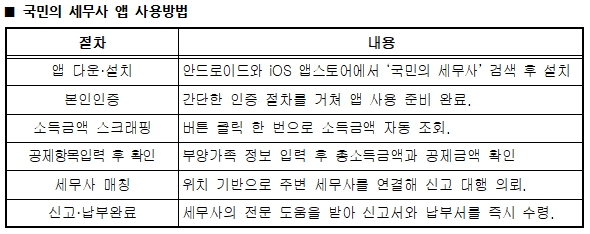 ¡®±¹¹ÎÀÇ ¼¼¹«»ç¡¯ ¾ÛÀº ³³¼¼ÀÚ°¡ ½º¸¶Æ®Æù¿¡¼ º»ÀÎÀÎÁõ¸¸ Çϸé Á÷Á¢ ȨÅýº¿¡ Á¢¼ÓÇÏÁö ¾Ê¾Æµµ ¼Òµæ±Ý¾×À» ÀÚµ¿À¸·Î ½ºÅ©·¡ÇÎÇϰí, ºÎ¾ç°¡Á· µîÀÇ °øÁ¦Ç׸ñÀ» ÀÔ·ÂÇÏ¿© º»ÀÎÀÇ ÃѼҵæ±Ý¾×°ú °øÁ¦±Ý¾×À» È®ÀÎÇÏ¸é ¹Ù·Î ¼¼¹«»ç°¡ ½Å°íÇÒ ¼ö ÀÖ´Â ´ë±¹¹Î ¸ÂÃãÇü ³³¼¼Áö¿ø ¾ÛÀÌ´Ù. »ç¿ëÀÚ´Â ¾Û ³»¿¡¼ À§Ä¡±â¹ÝÀ» ÅëÇØ Çѱ¹¼¼¹«»çȸ°¡ ÃßõÇÏ´Â ¼¼¹«»ç Áß º»ÀÎÀÌ ¿øÇÏ´Â ¼¼¹«»ç¸¦ Á÷Á¢ ¼±ÅÃÇÏ¿© ½Å°í ´ëÇàÀ» ÀÇ·ÚÇÒ ¼ö ÀÖÀ¸¸ç, ±¹¼¼Ã» ȨÅýº¿Í ¿¬µ¿ÇÏ¿© ¼Òµæ³»¿ªÀÌ ÀÚµ¿À¸·Î Áö¿øµÇ¹Ç·Î À̸¦ ÅëÇØ ½Å°í¼, ³³ºÎ¼ÀÇ Áï½Ã ¼öÃë°¡ °¡´ÉÇØÁ³´Ù. ½Å¼ÓÇϰí Á¤È®ÇÑ ¡®±¹¹ÎÀÇ ¼¼¹«»ç¡¯ ¼ºñ½º´Â ³³¼¼ÀÚ¿Í ¼¼¹«»ç°£ ½Å·Ú¸¦ °ÈÇÏ°í ³³¼¼ÀÚÀÇ ½Ã°£°ú ºñ¿ëÀ» Àý¾àÇÏ´Â µ¥ Å©°Ô ±â¿©ÇÒ °ÍÀ¸·Î º¸ÀδÙ. ¡®±¹¹ÎÀÇ ¼¼¹«»ç¡¯´Â ºñÀü¹®°¡µµ ½±°Ô »ç¿ëÀÌ °¡´ÉÇϵµ·Ï Á÷°üÀûÀÎ UI(User Interface)¸¦ Á¦°øÇϸç, ³³¼¼ÀÚ °³°³ÀÎÀÇ »óȲ¿¡ ¸Â´Â ¸ÂÃãÇü Àý¼¼»ó´ãÀÌ °¡´ÉÇϵµ·Ï ±â´ÉÀ» ±¸ÇöÇß´Ù. ¾Æ¿ï·¯ ¾ÛÀ» ÅëÇØ Á¶¼¼Àü¹®°¡ÀÎ ¼¼¹«»ç¿Í ÀüÈ»ó´ãÀÌ °¡´ÉÇÏ¿© ¼¼±Ý¿¡ ´ëÇÑ ±¹¹ÎµéÀÇ ¾Ö·Î»çÇ×À» ÃÖÀϼ±¿¡¼ °¡Àå ºü¸£°Ô ÇØ°áÇØÁÖ´Â ³³¼¼µµ¿ì¹Ì ¿ªÇÒÀ» ÇÒ °ÍÀ¸·Î ±â´ëµÈ´Ù.