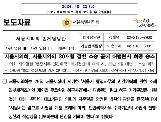 À̹ø¿¡ ¼¿ï½ÃÀÇȸ°¡ °³Á¤ÇÑ ¼¿ï½Ã ¹Î°£À§Å¹ Á¶·Ê´Â Áö³ 2021³â ¹Î°£À§Å¹»ç¾÷¿¡ ´ëÇÑ È¸°è°¨»ç¸¦ »ç¾÷ºñ°á»ê¼°Ë»ç·Î °³Á¤Çϰí ȸ°è»ç ¿Ü¿¡µµ ¼¼¹«»çµµ Âü¿©ÇÒ ¼ö ÀÖ°Ô Çϵµ·Ï ¼¿ï½Ã ¹Î°£À§Å¹ Á¶·Ê¸¦ °³Á¤ÇÏ¿´À¸³ª, ÀÌ¿¡ ´ëÇÏ¿© °øÀÎȸ°è»çȸ ¼Ò°ü Áß¾ÓÇàÁ¤±â°üÀÎ ±ÝÀ¶À§¿øÈ¸°¡ ÀÌ Á¶·Ê¾ÈÀÌ °øÀÎȸ°è»ç¹ý¿¡¼ Á¤ÇÑ È¸°è°¨»ç°¡ ȸ°è»çÀÇ Á÷¹«¶ó´Â ±ÔÁ¤À» À§¹ÝÇÑ °ÍÀ̶ó¸é¼ ÀçÀǿ䱸Çϰí ÀÌ¿¡ ´ëÇÏ¿© ¼¿ï½ÃÀÇȸ´Â ÀçÀǰáÇß°í ´Ù½Ã ÁýÇàÁ¤Áö¿Í ´ë¹ý¿ø¿¡ ¼Ò¼Û±îÁö °ÉÀÚ 30°³¿ù¿¡ °ÉÄ£ ¹ýÁ¤ ´ÙÅù ³¡¿¡ ´ë¹ý¿ø¿¡¼ ½Â¼ÒÆÇ°á±îÁö ¹Þ¾Æ ½ÃÇàÇϰí ÀÖ´Â °ÍÀ» ´Ù½Ã °ú°Å·Î ȸ±Í½ÃŰ´Â °ÍÀÌ´Ù. ù°, ¼¿ï½ÃÀÇȸÀÇ¡°ÇØ´ç Á¶·Ê¾ÈÀº Á÷±Ç»óÁ¤ ´ë»óÀÌ ¾Æ´Ï´Ù.¡±¶ó°í ÇØ¸í¿¡ ´ëÇÏ¿© ¼¿ï½ÃÀÇȸ ÃÖÈ£Á¤ ÀÇÀåÀÌ ¼¿ï½Ã ¹Î°£À§Å¹ Á¶·Ê°³Á¤¾ÈÀ» ¿©¾ß ´ëÇ¥ µîÀÇ ÇÕÀÇ µî ÇÊ¿äÇÑ ÀýÂ÷¸¦ °ÅÄ¡Áö ¾Ê°í ÀϹæÀûÀ¸·Î º»È¸ÀÇ¿¡ ºÎÀÇÇÑ °ÍÀ» ³õ°í Á÷±Ç»óÁ¤À̶ó ÇÑ °ÍÀº ÀûÀýÇÏ°íµµ ´ç¿¬ÇÏ´Ù. Á÷±Ç»óÁ¤À̶õ ±¹È¸ÀÇÀåÀÌ ¹ý»çÀ§ ÅëÇÏÁö ¾Ê°í º»È¸ÀÇ¿¡ Á÷±Ç»óÁ¤ÇÏ´Â ¿¹¿ÜÀû ÀýÂ÷¿¡ ÇÑÁ¤ÇÏ´Â °ÍÀÌ ¾Æ´Ï¶ó Åë»óÀû ÀýÂ÷¿Í °ü·Ê¸¦ °ÅÄ¡Áö ¾Ê°í ÀÇÀå ½º½º·Î ¹ý¾ÈÀ» º»È¸ÀÇ¿¡ »óÁ¤ÇÑ´Ù´Â Æ÷°ýÀûÀÎ ¿ë¾îÀÏ »ÓÀÌ´Ù. ¼¿ï½ÃÀÇȸ ÃÖÈ£Á¤ ÀÇÀåÀº Áö³ÇØ º»È¸ÀÇ¿¡¼ °¢´ç ÀÇÃѰú ¿©¾ß ¿ø³»´ëÇ¥ ÇÕÀÇ·Î Á¶·Ê°³Á¤¾ÈÀÌ »óÁ¤µÇ´Â ¾ÊÀ¸¸é¼ ³í¶õÀÌ È®´ëµÇ°í ¼¿ï½Ã°¡ ÇöÇà Á¶·Ê¿¡ µû¶ó ÅëÇÕ »ç¾÷ºñ°á»ê¼°Ë»ç ÀÔÂûÀ» ÁøÇà ÁßÀÎ »óȲ°ú ÀÌÇØ°ü°èÀÚµéÀÌ Âù¹Ý Áýȸ¸¦ °Ý·ÄÇÏ°Ô ÇÏ´Â »óȲ¿¡¼ ´ç¿¬È÷ »óÁ¤À» À§Çؼ´Â ¸¶¶¥È÷ ¿©¾ß ÇÕÀdzª Ãß°¡ÀûÀÎ ³íÀǸ¦ ÇØ¾ß ÇÔ¿¡µµ À̸¦ ¸ðµÎ ¹«½ÃÇß´Ù. ÃÖÈ£Á¤ ÀÇÀåÀº Áö³ 2¿ù 5ÀÏ ¼¿ï½Ã ÀÇÀå´Ü°ú ¿©¾ß »óÀÓÀ§¿øÀå ¿¬¼®È¸ÀǸ¦ °®°í ¼¿ï½Ã ¹Î°£À§Å¹ Á¶·Ê°³Á¤¾ÈÀ» º»È¸ÀÇ¿¡ »óÁ¤ÇÏÁö ¾Ê±â·Î °áÁ¤ÇÑ ¹Ù ÀÖÀ¸¸ç, 3¿ù 7ÀÏ º»È¸ÀÇ¿¡ ¾Õ¼¼µµ ±¹¹ÎÀÇÈû°ú ´õºÒ¾î¹ÎÁÖ´ç ¿ø³»´ëÇ¥ ¸ðµÎ »óÁ¤À» ¹Ý´ëÇÏ´Â ÀÔÀåÀ» Ç¥¸íÇß´Ù. ±×·³¿¡µµ ¾È°Ç »óÁ¤¿¡ ¾Õ¼ ¿©¾ß ¿ø³»´ëÇ¥¿Í ÇùÀÇÇÏ¿© ¾È°Ç »óÁ¤À» °áÁ¤ÇÏ¿©¾ß ÇÏ´Â ÃÖÈ£Á¤ ÀÇÀåÀÌ ÀÌ¹Ì ÀÇÀå´Ü°ú ¿©¾ß »óÀÓÀ§¿øÀå ¿¬¼®È¸ÀÇ¿¡¼ »óÁ¤ÇÏÁö ¾Ê±â·Î °áÁ¤ÇÏ°í º»È¸ÀÇ ´çÀÏ¿¡µµ ¿©¾ß ¿ø³»´ëÇ¥°¡ ÇùÀÇÇÏ¿© ÇØ´ç Á¶·Ê¾ÈÀÇ »óÁ¤À» ¹Ý´ëÇϰí ÀÖ´Â »óȲ¿¡¼ ÀÇÀåÀÇ °íÀ¯±ÇÇÑÀ̶ó°í ÇÏ¸é¼ Á÷±Ç»óÁ¤Çϴ Ȳ´çÇÑ °ú´Ü¼ºÀ» º¸¿©ÁÖ¾ú´Ù. µÑ°, ¼¿ï½ÃÀÇȸÀÇ¡®Áö³ÇØ 12¿ù 20ÀÏ »óÁ¤µÇÁö ¾ÊÀº ¾È°ÇÀ¸·Î »óÁ¤ÀÚü°¡ µÇÁö ¾Ê¾ÒÀ¸¹Ç·Î »óÁ¤ºÎ°áÀº ¼º¸³ÇÒ ¼ö ¾ø´Ù¡¯´Â ÇØ¸í¿¡ ´ëÇÏ¿©: Áö³ÇØ 12¿ù 20ÀÏ º»È¸ÀÇ ´ç½Ã¿¡µµ ÇØ´ç ¹Î°£À§Å¹ Á¶·Ê¾ÈÀÇ »óÁ¤¿¡´Â ¸¹Àº ¹Ý´ë°¡ ÀÖ¾ú´Ù. ¾ß´çÀº ÇØ´ç ¾È°Ç¿¡ ´ëÇÑ Àǰῡ º¸ÀÌÄàÀ» ÇϰíÀÚ Çß°í, ¿©´ç ÀÇÃÑ¿¡¼µµ °³Á¤¾È ¹ßÀǸ¦ ¿©´ç ÀÇ¿øÀÌ ÇßÀ½¿¡µµ ºÒ±¸ÇÏ°í ¾È°Ç »óÁ¤Àº ¹°·Ð °³Á¤³»¿ë¿¡ ´ëÇØ ¸¹Àº ¹Ý´ë¿¡ ºÎµúÇû´Ù. ÀÌ¿Í °°Àº ¿©¾ßÀÇ °Å¼¾ ¹Ý´ë·Î ÀÎÇØ ´ç½Ã ÃÖÈ£Á¤ ÀÇÀåµµ º»È¸ÀÇ »óÁ¤À» º¸·ùÇÏ´Â °áÁ¤À» ÇÏ¿´´ø °ÍÀÌ´Ù. ÃÖÈ£Á¤ ÀÇÀåÀº ´ë¹ý¿ø ÆÇ°áÀÌ ÀÖ¾ú´ø ÀÛ³â 10¿ù 25ÀÏ ¡°ÁÖ¹ÎÀÇ ´ëÇ¥±â°üÀÎ ÀÇȸÀÇ ÀÚÁÖ±ÇÀ» ÀÎÁ¤ÇÑ ¹ý¿øÀÇ ÆÇ´ÜÀ» Á¸ÁßÇÑ´Ù¡±¸é¼ ¡°¼¿ï½Ã´Â ¾ÕÀ¸·Î ½ÃÇàµÉ °³Á¤ Á¶·Ê¿¡ µû¶ó, ¹Î°£À§Å¹»ç¹« ¼öʱâ°üÀÇ »ç¾÷ºñ ÁýÇàÁ¤»êÀÇ ÀûÁ¤¼ºÀ» ´ãº¸Çϴµ¥ ¸¸ÀüÀ» ±âÇØ¾ß ÇÑ´Ù¡±°í ¹àÈ÷±âµµ Çß´Ù.