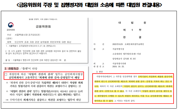 ´ç½Ã ¼¿ï½Ã´Â ÇöÇà ¹Î°£À§Å¹Á¶·Ê¿¡ ´ëÇØ ±× ÃëÁö¿¡ ÃæºÐÈ÷ °ø°¨Çϸç ȸ°è°¨»ç°¡ ¾Æ´Ï³ª ȸ°è°¨»ç¶ó°í ºÒ·È´ø ¾÷¹«(ÇöÇàÀÇ »ç¾÷ºñ °á»ê¼ °Ë»ç)¿¡ ´ëÇØ ¼¼¹«»ç°¡ ¼öÇàÇÒ ¼ö ÀÖ´Ù°í ÇÏ¸é¼ ÇöÇà ¹Î°£À§Å¹Á¶·Ê¿¡ ´ëÇØ Àû±Ø Âù¼ºÇÏ´Â ÀÔÀåÀ̾úÁö¸¸, ±ÝÀ¶À§¿øÈ¸ÀÇ ÀçÀǿ䱸 Áö½Ã¿¡ µû¶ó ¾î¿ ¼ö ¾øÀÌ ¼¿ï½ÃÀÇȸ¿¡ ÀçÀǸ¦ ¿ä±¸Çß°í 2022³â 4¿ù ¼¿ï½ÃÀÇȸ°¡ ÀçÀǰá±îÁö ÇÏ¿´°í, ÀÌ¿¡ µû¶ó ¼¿ï½Ã´Â °øÆ÷¸¦ ÇϰíÀÚ ÇÏ¿´À¸³ª ±ÝÀ¶À§¿øÈ¸°¡ ȸ°è»ç¹ý À§¹ÝÀ» °íÁýÇÏ¸é¼ ¹ý¿ø¿¡ ÁýÇàÁ¤Áö¸¦ °É°í ´ë¹ý¿ø¿¡ ¹«È¿È®ÀμҼÛÀ» Á¦±âÇÏ°Ô ÇÏ¿´´Ù.