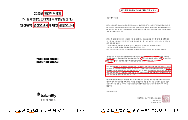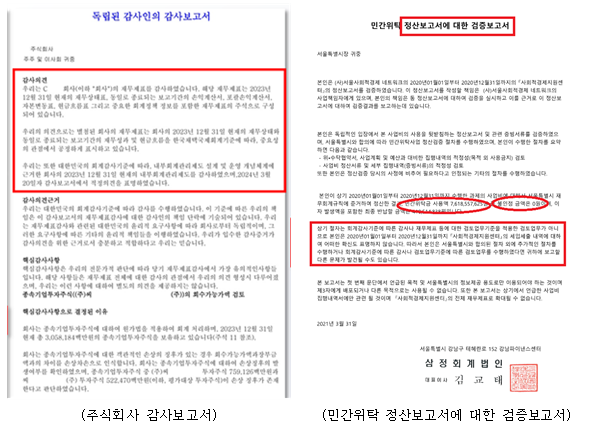 ȸ°è¹ýÀÎÀÌ °ËÁõ´ë»óÀ¸·Î »ï¾Ò´Ù´Â ¡®Á¤»êº¸°í¼¡¯´Â ¡¸º¸Á¶±Ý °ü¸®¿¡ °üÇÑ ¹ý·ü¡¹¿¡ µû¸¥ º¸Á¶»ç¾÷ÀÚ°¡ º¸Á¶»ç¾÷¿¡ ´ëÇÑ ½ÇÀûº¸°í¼¿Í ÇÔ²² ¡®Á¤»êº¸°í¼¡¯¸¦ ÀÛ¼ºÇϵµ·Ï Àǹ«ÈµÇ¾î ÀÖ°í(Á¦27Á¶ Á¦2Ç×), º¸Á¶±ÝÀÌ 10¾ï¿ø ÀÌ»óÀÎ °æ¿ì Á¤»ê°ËÁõÀÌ ¾Æ´Ñ ȸ°è°¨»ç¸¦ ¹Þ°í °¨»çº¸°í¼¸¦ Á¦ÃâÇϵµ·Ï Çϰí ÀÖ´Ù. °á±¹, ȸ°è¹ýÀÎÀº ¹Î°£¼öŹ»ç¾÷ÀÚ°¡ ÀÛ¼ºÇϰųª Á¦ÃâÇÏÁöµµ ¾ÊÀº À¯·É ¡®Á¤»êº¸°í¼¡¯¸¦ °ËÁõÇß´Ù´Â °ÍÀÌ°í ¼³»ç Á¤»êº¸°í¼¸¦ °ËÁõÇß´Ù ÇØµµ À̴ ȸ°è°¨»ç°¡ ¾Æ´ÔÀÌ ´õ¿í ºÐ¸íÇØÁø´Ù. ![]() ![]() ȸ°è¹ýÀÎÀÌ Á¦ÃâÇÑ °ÍÀº ¡®°¨»çº¸°í¼¡¯°¡ ¾Æ´Ñ ¡®Á¤»êº¸°í¼¿¡ ´ëÇÑ °ËÁõº¸°í¼¡¯¸¦ Á¦ÃâÇÏ¿© ¿Ô´Âµ¥, Á¶·Ê´Â ¸í¹éÇÏ°Ô °á»ê¼¿¡ ´ëÇÑ È¸°è°¨»ç¸¦ Çϵµ·Ï Àǹ«ÈÇÏ°í ¿ë¿ª°è¾à¿¡¼µµ ¡®°ËÁõº¸°í¼¡¯¸¦ ¿ä±¸ÇÑ »ç½ÇÀÌ ¾ø´Ù. °øÀÎȸ°è»çȸ°¡ ¹Î°£À§Å¹ ȸ°è°¨»ç´Â ¡®Á¤»ê°¨»ç¡¯¶ó°í ±º»öÇÑ º¯¸íÀ» ³»³õ°í ÀÖÀ¸³ª, À̸¶Àúµµ ¡®°¨»ç¡¯°¡ µÇ¾î¾ß ÇÏ´Â °ÍÀÌ¸ç °¨»ç¿Í °ËÁõÀº ȸ°è»çȸ°¡ ±×µ¿¾È ÁÖÀåÇØ¿Â ´ë·Î ¾öû³ Â÷À̸¦ °®°í ÀÖ¾î ȸ°è°¨»ç¸¦ ÇÏÁö ¾Ê°í °¨»çº¸°í¼¸¦ Á¦ÃâÇÏÁö ¾ÊÀº »ç½ÇÀº ´Þ¶óÁöÁö ¾Ê´Â´Ù. ȸ°è°¨»ç´Â ȸ°è»çÀÇ ¹èŸÀû Á÷¹«À̹ǷΠ¡®°¨»ç¡¯¶ó´Â ¿ë¾î¸¦ ¾²´Â °Í°ú ¾²Áö ¾Ê´Â °Í¿¡ ¿ë¿ª º¸¼ö¿Í °¨»ç Á÷¹« Ã¥ÀÓ¿¡¼ ¸Å¿ì Å« Â÷À̰¡ ÀÖÀ½Àº µÎ¸»ÇÒ Çʿ䰡 ¾ø´Ù. ´õ±¸³ª, ȸ°è¹ýÀÎÀÌ Á¦ÃâÇÑ ¡®Á¤»êº¸°í¼¿¡ ´ëÇÑ °ËÁõº¸°í¼¡¯ÀÇ Çü½Ä°ú ³»¿ëÀ» º¸¸é ´õ¿í Ȳ´çÇÏ´Ù. Á¶·Ê¿Í ¿ë¿ª°è¾à¿¡¼ ÇØ´ç ȸ°è¹ýÀο¡°Ô ¿ä±¸Çϴ ȸ°è°¨»ç´Â ȸ°è°¨»ç±âÁØ¿¡ µû¸¥ °¨»ç¼öÇàÀÌ°í ¡®°¨»ç¡¯¶ó¸é °¨»çÀǰßÀ» Ç¥¸íÇÏ´Â °ÍÀº ´ç¿¬ÇÔ¿¡µµ À̸¦ ÀüÇô ÁöŰÁö ¾Ê¾Ò´Ù. ½ÉÁö¾î ÇØ´ç ¹®°Ç¿¡´Â ¡°»ó±â ÀýÂ÷´Â ȸ°è°¨»ç±âÁØ¿¡ µû¸¥ °¨»ç³ª À繫Á¦Ç¥ µî¿¡ ´ëÇÑ °ËÅä¾÷¹« ±âÁØÀ» Àû¿ëÇÑ °ËÅä¾÷¹«°¡ ¾Æ´Ï¹Ç·Î ¡¦ ¼¼ÀÔ¼¼Ãâ ³»¿ª¿¡ ´ëÇÏ¿© ¾î¶°ÇÑ È®½Åµµ Ç¥¸íÇÏÁö ¾Ê½À´Ï´Ù¡±¶ó°í±îÁö ÇÏ´Â µµÀúÈ÷ ¼¼±Ý³¶ºñ¸¦ ¸·´Â ¿ÜºÎ°ËÁõÀÎÀÌÀÚ °ø½Å·Â ÀÖ´Â Àü¹®°¡°¡ ÀÛ¼º Á¦ÃâÇÑ °ÍÀ¸·Î º¸±â¿¡´Â ÇØ±«ÇÑ ³»¿ë±îÁö °Åħ¾øÀÌ ±âÀçµÇ¾îÀÖ´Ù. ÀÌó·³ ¼¿ï½Ã ¹Î°£À§Å¹ Á¶·Ê¿¡ µû¶ó ȸ°è°¨»ç¸¦ ÇÏ¿©¾ß Çϰí ÅëÇÕȸ°è°¨»ç ÀÔÂû ¿ë¿ª¿¡ µû¶ó ȸ°è°¨»ç¸¦ ¼öÁÖÇÑ È¸°è¹ýÀεéÀº °¨»çº¸°í¼¸¦ Á¦ÃâÇÏÁö ¾Ê¾Ò°í ÀÖÁöµµ ¾ÊÀº Á¤»êº¸°í¼¸¦ °ËÁõÇß´Ù°í ÇÔÀ¸·Î½á ½ÇÁ¦ ȸ°è°¨»ç¸¦ ÇÏÁö ¾ÊÀº »ç½ÇÀÌ ¸í¹éÇϸç, ȸ°è¹ýÀÎÀÌ Á¦ÃâÇÑ È¸°è°¨»ç ¾Æ´Ñ ¸ðÁ¾ÀÇ ¹®°Ç¿¡µµ ȸ°è°¨»ç±âÁØÀ̳ª À繫Á¦Ç¥ °ËÅä±âÁØ µîÀ» ÀüÇô Àû¿ëÇÏÁö ¾Ê¾Ò´Ù°í ½º½º·Î ¹àÈ÷°í ÀÖ°í ÀÛ¼º³»¿ë¿¡ Ã¥ÀÓÀ»ÁöÁö ¾Ê°Ú´Ù°í ¸í±âÇÏ´Â µî ¼¼±Ý³¶ºñ¸¦ ¸·±â À§ÇØ ¶Ç´Ù½Ã ¿¹»êÀ» »ç¿ëÇÏ´Â °ø°ø¼º ³ôÀº ȸ°è°¨»ç¸¦ ºÎÁ¤ÇÏ°Ô ÇÑ »ç½ÇÀÌ ¸í¹éÈ÷ È®ÀεȴÙ. ¶Ç ÇØ´ç ¹®°Ç¿¡´Â ºÒÀÎÁ¤ ±Ý¾× µî Àû¹ßÇÑ »çÇ×ÀÌ ¾øÀÌ ¼öʱâ°üÀÌ ÀÛ¼ºÇÑ ¿¹»ê°ú ÁýÇà, Àܾװú ÀÌ¿ù¾× ¹× ¹Ý³³¾× µîÀ» À̱âÇÑ °Í¿¡ ºÒ°úÇÑ »ç½ÇÀÌ ¸í¹éÈ÷ È®ÀεȴÙ. ¶ÇÇÑ, ȸ°è°¨»ç¸¦ ÇÏ¿´´Ù¸é ´ç¿¬È÷ Á¡°ËÇØ¾ß ÇÏ´Â ¼öʱâ°üÀÇ Àǹ«»çÇ×À¸·Î ¸í½ÃÇϰí ÀÖ´Â 66°³ Ç׸ñ(¼öŹÀç»ê °ü¸®, »ç¾÷°èȹ ¹× ¼öÇà µî)°ú °¢Á¾ »ç¾÷°ü¸®¿¡ °üÇÑ ¼¼¼¼ÇÑ °¨»çÇ׸ñº° °¨»çÁ¶¼¸¦ ºñÄ¡Çϰí Á¦ÃâÇÒ ¼ö ÀÖ¾î¾ß ÇÔ¿¡µµ ȸ°è¹ýÀεéÀº °ÅÀÇ µµÀ常 Âï¾îÁÖ´Â ¼¿ï½Ã ¹Î°£À§Å¹ ȸ°è°¨»ç¸¦ ÇÑ °ÍÀÌ ¸í¹éÇÏ´Ù. ÀÌó·³ ȸ°è¹ýÀÎÀº ¼¿ï½Ã ¹Î°£À§Å¹ Á¶·Ê°ú ÅëÇÕȸ°è°¨»ç ÀÔÂû ¿ë¿ª°è¾à¿¡¼ ¿ä±¸Çϴ ȸ°è°¨»ç¸¦ ÇÏÁö ¾Ê°í ¸Å³â ¾à 10¾ï¿ø¿¡ ´ÞÇϴ ȸ°è°¨»ç ¿ë¿ªº¸¼ö¸¦ ¹Þ¾Æ°£ »ç½ÇÀÌ È®ÀεǸç, ¼¿ï½Ã´Â ÀÌ·¯ÇÑ ºÎ½Çȸ°è°¨»ç°¡ ÀÌ·ïÁö°í ÀÖ´Ù´Â »ç½ÇÀ» ¾Ë¸é¼µµ ȸ°è¹ýÀÎÀÌ Á¦ÃâÇÑ ¹®°ÇÀ» Á¦´ë·Î È®ÀÎÇϰųª ȸ°è°¨»ç°¡ ½Ç½ÃµÇ¾ú´ÂÁö Á¦´ë·Î °ËÁõÇÏÁö ¾Ê°í ÇöÀç±îÁö À̸¦ °ËÅäÇÏÁö ¸øÇÔÀ¸·Î½á ¸Å³â 6õ¾ï~1Á¶¿ø¿¡ ´ÞÇÏ´Â ¹Î°£À§Å¹»ç¾÷ºñ¿¡ ´ëÇÑ È¸°è°¨»ç °ËÁõÀÌ ºÎ½ÇÀÌ ÃÊ·¡µÈ °ÍÀº ¹°·Ð ¸Å³â 10¾ï¿ø¿¡ °¡±î¿î ȸ°è°¨»ç ¿ë¿ªº¸¼ö±îÁö ºÎ´çÁö±ÞµÇ¾î ¼¿ï½Ã ¹Î°£À§Å¹»ç¾÷ ȸ°è°¨»ç ¹× °¨µ¶ ¾÷¹«°¡ ÃÑüÀû ºÎ½Ç·Î ÀÌ·ïÁ³´Ù°í ÇÒ °ÍÀÌ´Ù. [ȸ°è¹ýÀÎ ¡®°ËÁõº¸°í¼¡¯ Á¦Ãâ(ºÎ½Ç°ËÁõ)ÇÏ°í °Å¾×ÀÇ ÅëÇÕȸ°è°¨»ç ¿ë¿ªºñ ¼ö±Þ] ![]() ![]() ![]() ¼¿ï½Ã°¡ ÃÖ±Ù 5°³³â°£ ½Ç½ÃÇÑ ¹Î°£À§Å¹»ç¾÷ ÅëÇÕȸ°è°¨»ç ¿ë¿ªÀÔÂû°