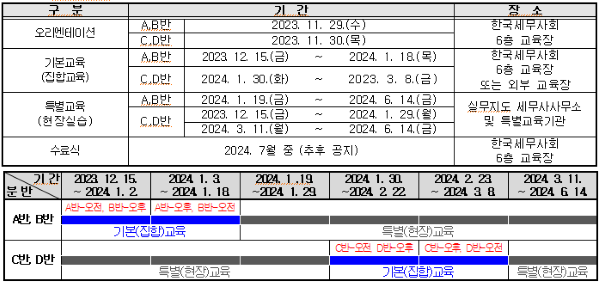 2024³â ¼ö½À¼¼¹«»ç ½Ç¹«±³À°À» ´ÙÀ½°ú °°ÀÌ ½Ç½ÃÇÏ´Ï ±³À°À» Èñ¸ÁÇÏ´Â ¼¼¹«»ç ÀڰݽÃÇè ÇÕ°ÝÀÚ´Â Á¢¼ö±â°£ ³»¿¡ ±³À°À» ½ÅûÇÏ¿© Áֽñ⠹ٶø´Ï´Ù. ´Ù À½ 1. ±³À°´ë»ó : ¼¼¹«»ç ÀڰݽÃÇè ÇÕ°ÝÀÚ(¼¼¹«»ç¹ý Á¦3Á¶ Á¦1È£¿¡ ÇØ´ç ÇÏ´Â ÀÚ) 2. ±³À°±Ù°Å : ¼¼¹«»ç¹ý Á¦12Á¶ÀÇ6, °°Àº ¹ý ½ÃÇà±ÔÄ¢ Á¦12Á¶ 3. ±³À°±â°£ : 2023. 12. 15.(±Ý) ~ 2024. 06. 14.(±Ý) ¡Ø ¿À¸®¿£Å×ÀÌ¼Ç : 2023. 11. 29.(¼ö) ~ 11. 30.(¸ñ) 2ÀÏ °£, °¢¹Ýº°·Î ¿ÀÀü, ¿ÀÈÄ ³ª´©¾î ÁøÇà