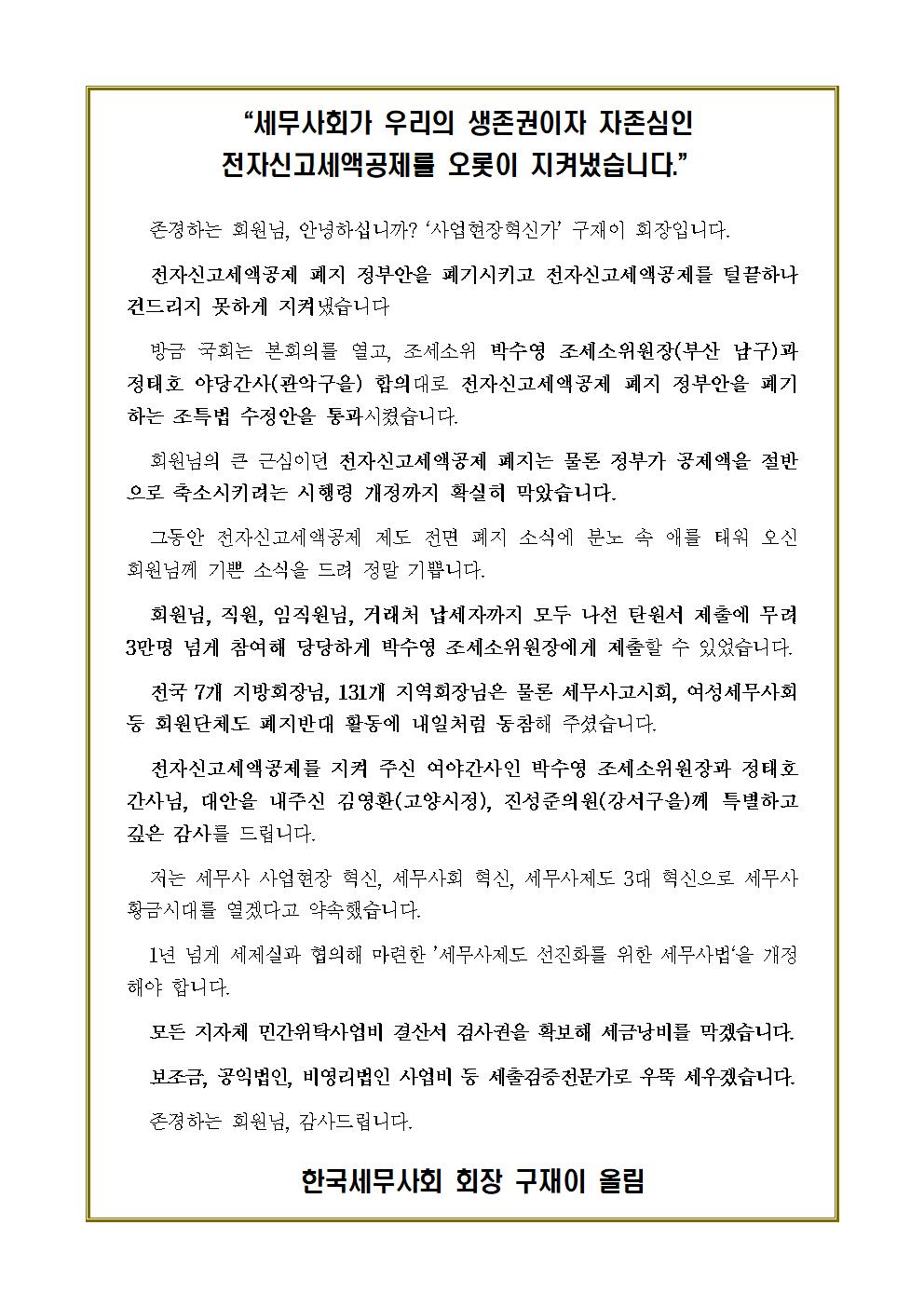 ¡°¼¼¹«»çȸ°¡ ¿ì¸®ÀÇ »ýÁ¸±ÇÀÌÀÚ ÀÚÁ¸½ÉÀÎ ÀüÀÚ½Å°í¼¼¾×°øÁ¦¸¦ ¿À·ÔÀÌ ÁöÄѳ½À´Ï´Ù.¡±
