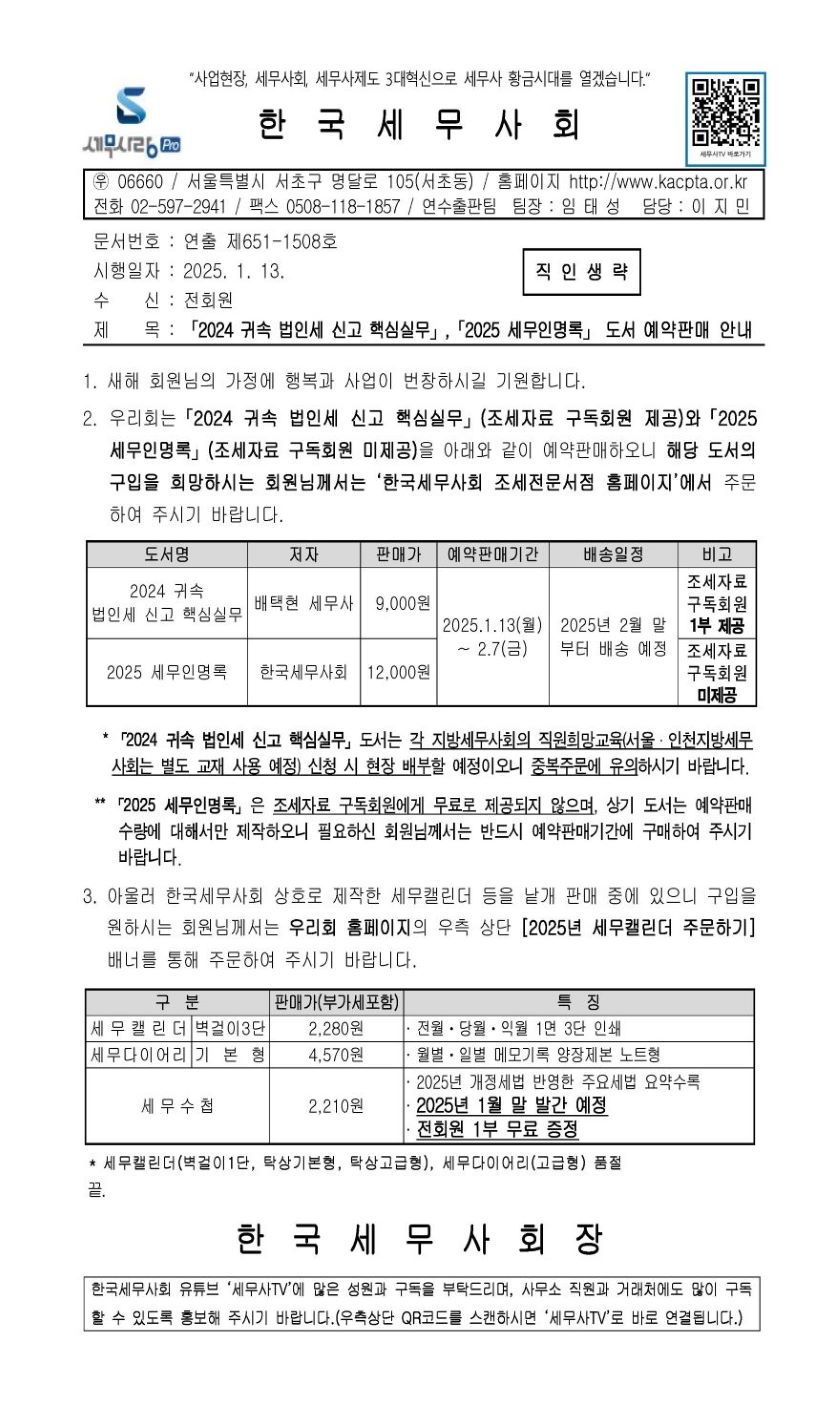 ¡¸2024 ±Í¼Ó ¹ýÀμ¼ ½Å°í Çٽɽǹ«¡¹,¡¸2025 ¼¼¹«Àθí·Ï¡¹ µµ¼ ¿¹¾àÆÇ¸Å ¾È³»