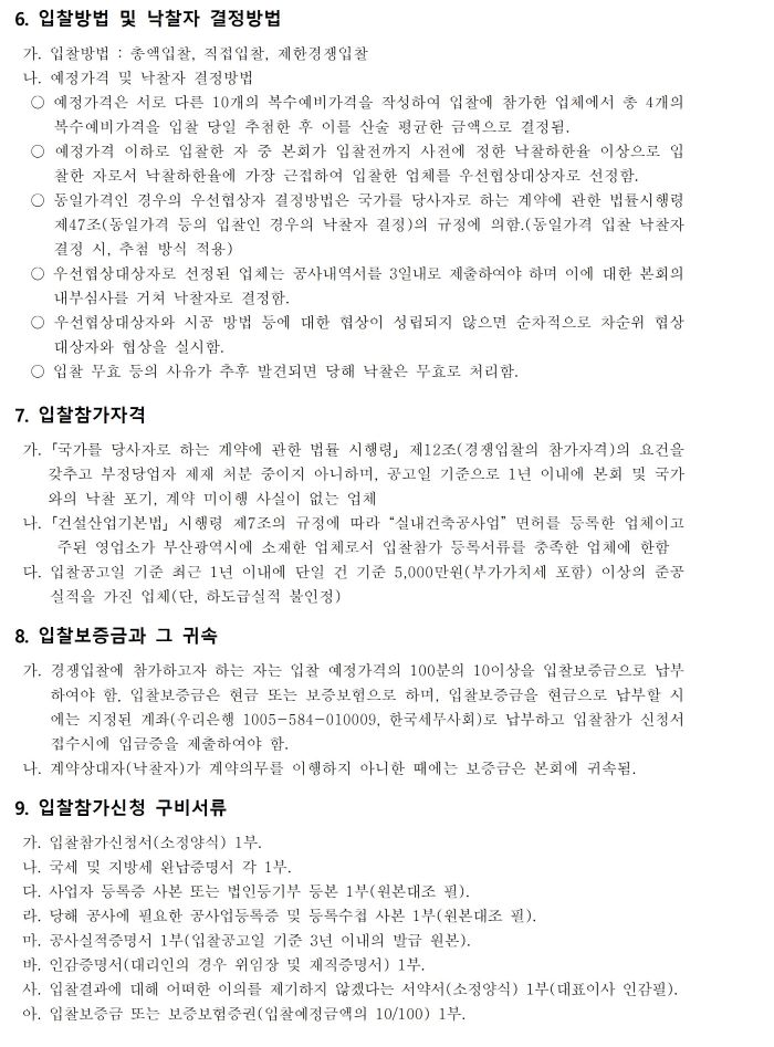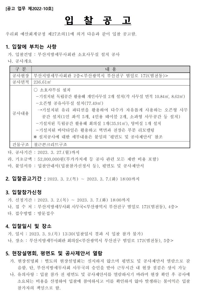 ºÎ»êÁö¹æ¼¼¹«»çȸ°ü ¼ÒÈ£»ç¹«½Ç ¼³Ä¡ °ø»ç Æò¸éµµ ¹× °ø»çÁ¦¾È¼(0).pdf ºÎ»êÁö¹æ¼¼¹«»ç°ü ¼ÒÈ£»ç¹«½Ç ¼³Ä¡°ø»ç °øÁ¾º°³»¿ª¼(0).xlsx (ºÙÀÓ)ºÎ»êÁö¹æ¼¼¹«»çȸ°ü ¼ÒÈ£»ç¹«½Ç ¼³Ä¡ °ø»ç ÀÔÂû¾È³»¼(ÀÔÂûÂü°¡½Åû¼µî)(1).hwp |