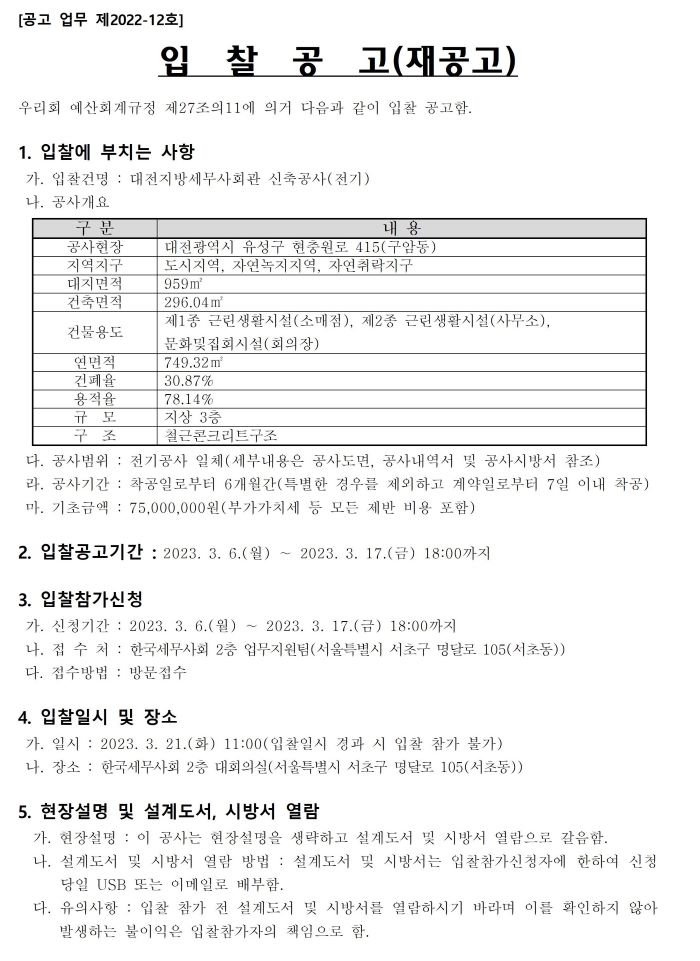 [ÀÔÂû°ø°í] ´ëÀüÁö¹æ¼¼¹«»çȸ°ü ½ÅÃà°ø»ç(Àü±â) ÀÔÂû°ø°í(Àç°ø°í)