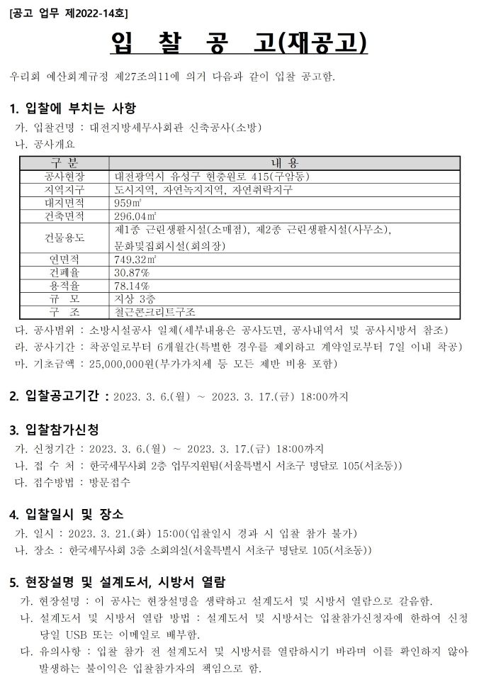 [ÀÔÂû°ø°í] ´ëÀüÁö¹æ¼¼¹«»çȸ°ü ½ÅÃà°ø»ç(¼Ò¹æ) ÀÔÂû°ø°í(Àç°ø°í)
