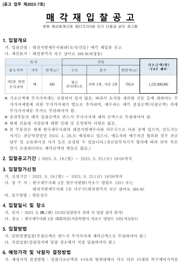 [¸Å°¢ÀÔÂû°ø°í]´ëÀüÁö¹æ¼¼¹«»çȸ°ü(ÅäÁö/°Ç¹°) ¸Å°¢ ÀçÀÔÂû °ø°í