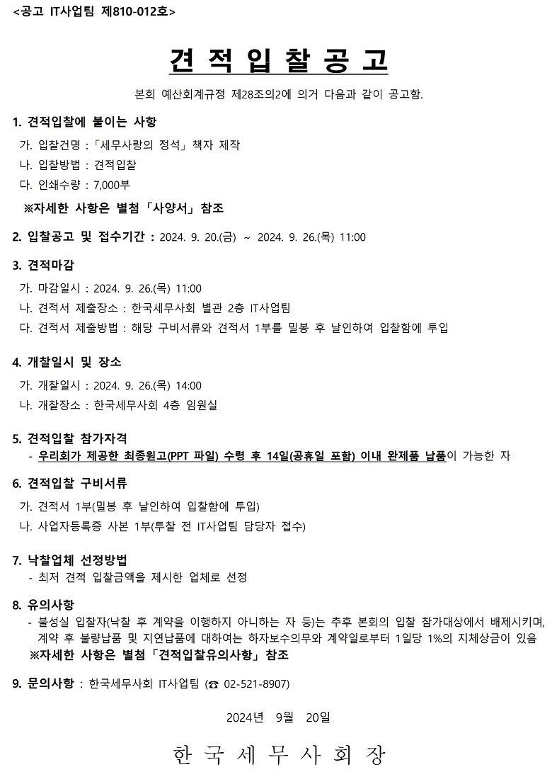 | ±ÛÁ¦¸ñ | [°ßÀûÀÔÂû]¼¼¹«»ç¶ûÀÇ Á¤¼® Ã¥ÀÚ Á¦ÀÛ °ø°í |