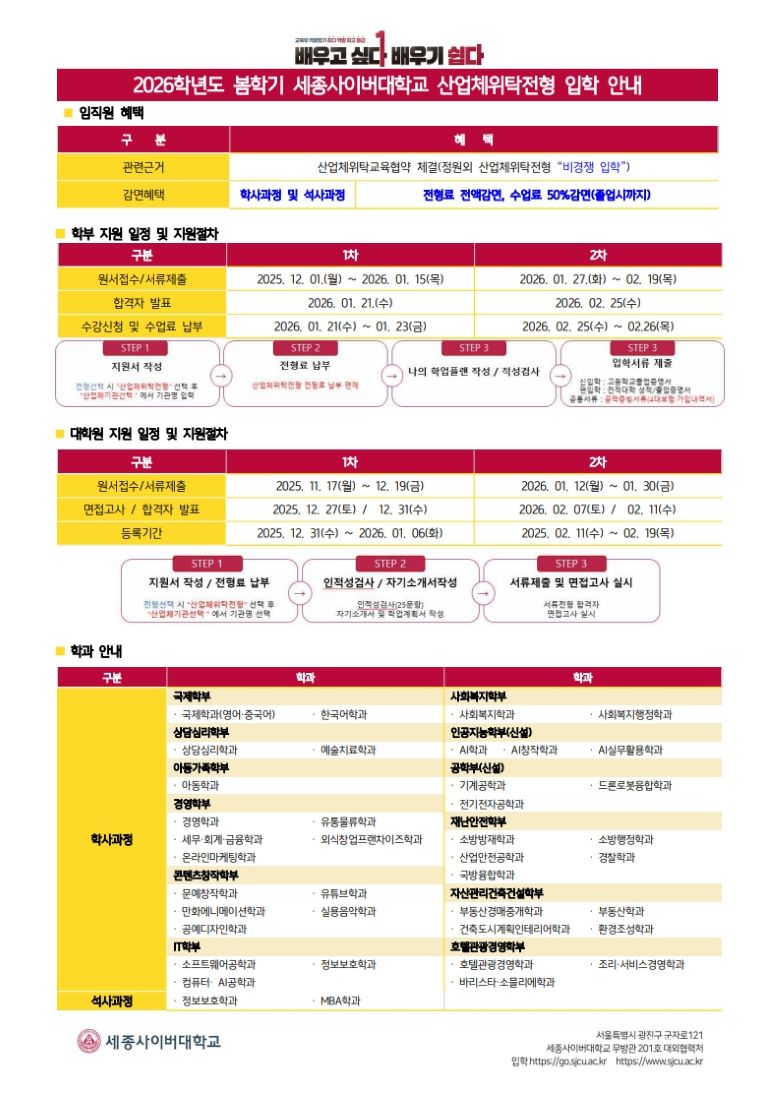 ¼¼Á¾»çÀ̹ö´ëÇб³¿¡¼ ¡®2026Çг⵵ º½Çб⠽š¤ÆíÀÔ»ý ¸ðÁý ¾È³»¡¯¿Í °ü·ÃÇÏ¿© ¿ì¸® ȸ¿¡ È«º¸ ¿äûÇÏ¿´±â¿¡ ¾Æ·¡¿Í °°ÀÌ ¾È³»ÇÕ´Ï´Ù. 1. ¸ðÁý±â°£ 1) 1Â÷ ¸ðÁý±â°£: 2025.12.1.(¿ù)~2026.1.15.(¸ñ) 2) 2Â÷ ¸ðÁý±â°£: 2026.1.27.(È)~2026.2.19.(¸ñ) 2. Áö¿ø¹æ¹ý: ÀÎÅÍ³Ý ¿ø¼ Á¢¼ö(ÀÔÇÐÁö¿ø¼¾ÅÍ È¨ÆäÀÌÁö: https://go.sjcu.ac.kr/go/) 3. ÇÕ°ÝÀÚ ¹ßÇ¥ 1) 1Â÷ ¸ðÁý¹ßÇ¥: 2026.1.21.(¼ö) 2) 1Â÷ ¸ðÁý¹ßÇ¥: 2026.2.25.(¼ö) 4.. ¹®ÀÇó: ¼¼Á¾»çÀ̹ö´ëÇб³ ¼¼¹«È¸°èÇаú: 02-2204-8040(8662)