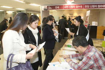 Çà»çÀÔ±¸ Á¢¼ö´ë¿¡ ±¸Á÷ÀÚµéÀÌ ¸ô¸®¸é¼­ ¾È³»¿¡ ³ª¼± ¼¼¹«»çȸ Á÷¿øµéÀÇ ¼Õ³î¸²µµ »¡¶óÁ³´Ù.