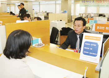 2½Ã°¡ µÇÀÚ ¼­¿ïÁ¾ÇÕ°í¿ëÁö¿ø¼¾ÅÍ 2Ãþ¿¡ ÀÚ¸®ÀâÀº ¼¼¹«Àη ä¿ë¹Ú¶÷ȸÀåÀº ±¸Á÷ÀÚµé·Î ¼ø½Ä°£¿¡ ºÏ»õÅëÀÌ µÆ´Ù.