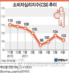 Çѱ¹ÀºÇàÀÌ 24ÀÏ ³»³õÀº `6¿ù ¼ÒºñÀÚµ¿ÇâÁö¼ö'¿¡ µû¸£¸é ¼ÒºñÀÚµéÀÇ °æÁ¦»óȲ¿¡ ´ëÇÑ ½É¸®¸¦ Á¾ÇÕÀûÀ¸·Î ³ªÅ¸³»´Â ¼ÒºñÀڽɸ®Áö¼ö(CSI)´Â ÀÌ´Þ Áß 102·Î Àü¿ùº¸´Ù 2Æ÷ÀÎÆ® Ç϶ôÇß´Ù.