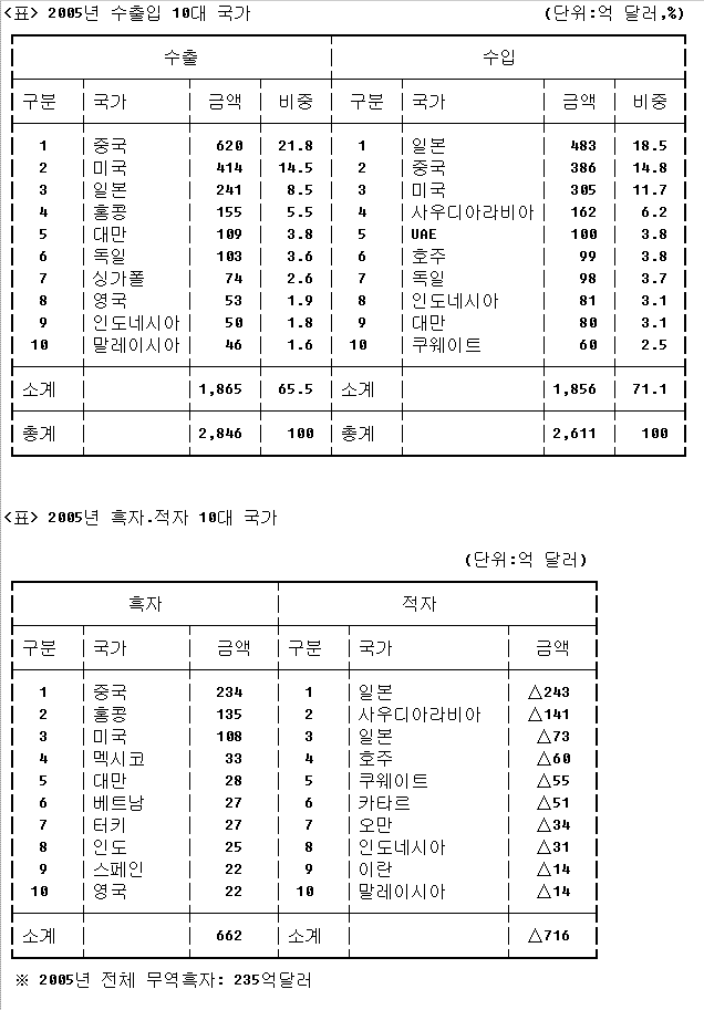 12ÀÏ °ü¼¼Ã»ÀÌ ³»³õÀº '2005³â ÁÖ¿ä ±¹°¡º° ¼öÃâÀÔÇöȲ'¿¡ µû¸£¸é Áß±¹°úÀÇ Àüü ¹«¿ª·®Àº 1õ5¾ï8õ¸¸´Þ·¯¿¡ ´ÞÇß´Ù.